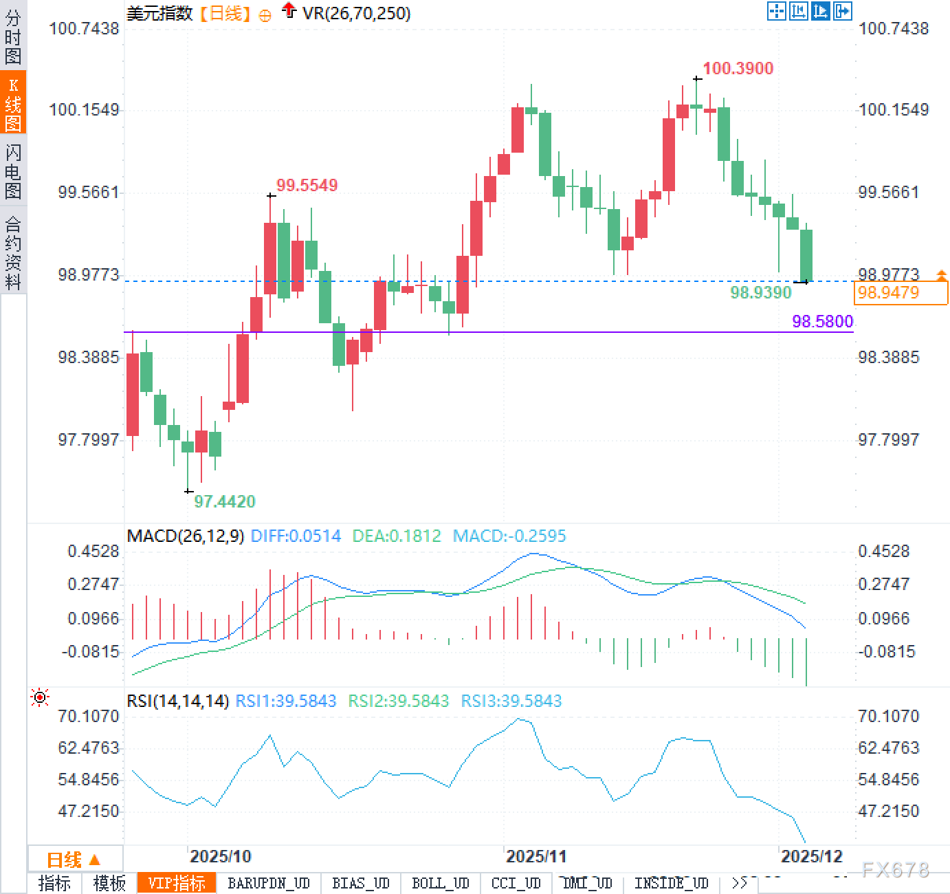 汇通财经APP讯——近期,美元指数整体走弱,价格回落至99一线附近。与部分风险资产价格偏强、债券市场相对平稳的表现相比,美元的疲软显得格外扎眼。分析师普遍认为,这不仅是技术层面的调整,更是对未来货币政策和经济前景预期的集中反映。
