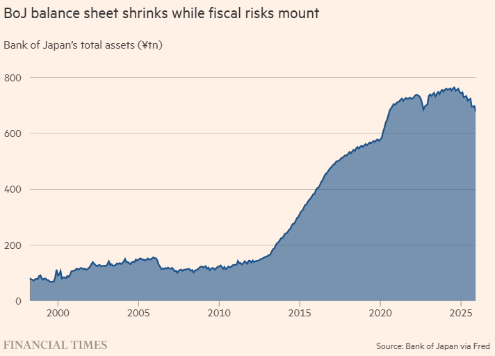 在实施量化宽松(QE)的多年间,日本央行为放宽货币环境积累了海量的国债。现在,它正以令人惊讶的速度,允许其中部分持有的债券到期而不进行再融资,实际上将其转回给私营部门投资者——这在本质上就是“量化紧缩”(QT)。
